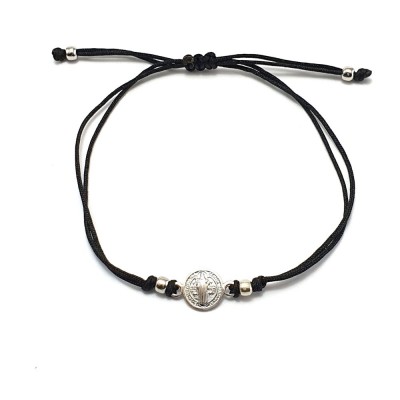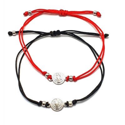 Pulsera con Medalla escapulario San Benito y Cruz en Plata Ley .925, Medida de Dije .8 cm diametro mas argollas. Elaborada en hilo rojo/negro de algodón. Al ser ajustable abre hasta 10 cm y puede cerrarse hasta para usarse en niños.